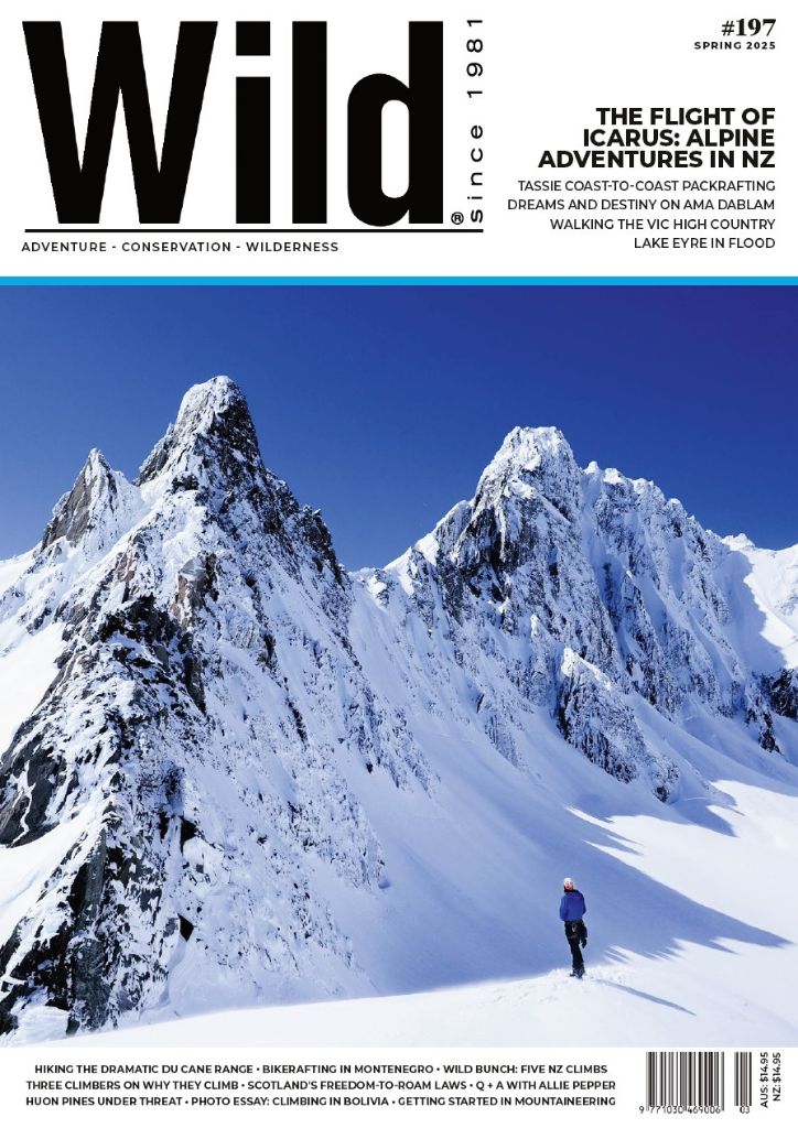 Wild #197 is here, packed with Australia’s best adventure, conservation, and wilderness writing. This issue explores alpinism and mountaineering, from a near-miss in NZ to climbing in Bolivia and Nepal, plus a Q&A with Allie Pepper. Also inside: hikes in Tassie, WA, and Vic; bike rafting in Montenegro; packrafting across Tasmania; and stories on ancient trees and Kati Thanda-Lake Eyre.