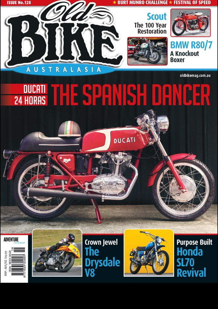 Old Bike Australasia Issue #128 celebrates classic motorcycles, their history, and the people behind them. Featuring the Ducati 24 Horas in The Spanish Dancer, plus standout stories on a 1923 Indian Scout restoration, Vincent-HRD Rapide, Bultaco Pursang, Honda SL70, BMW R80/7, Yamaha YDS-3, and Drysdale’s V8 builds. With event coverage, gear, race highlights, and more, this issue is packed with heritage, performance, and passion for classic bikes.